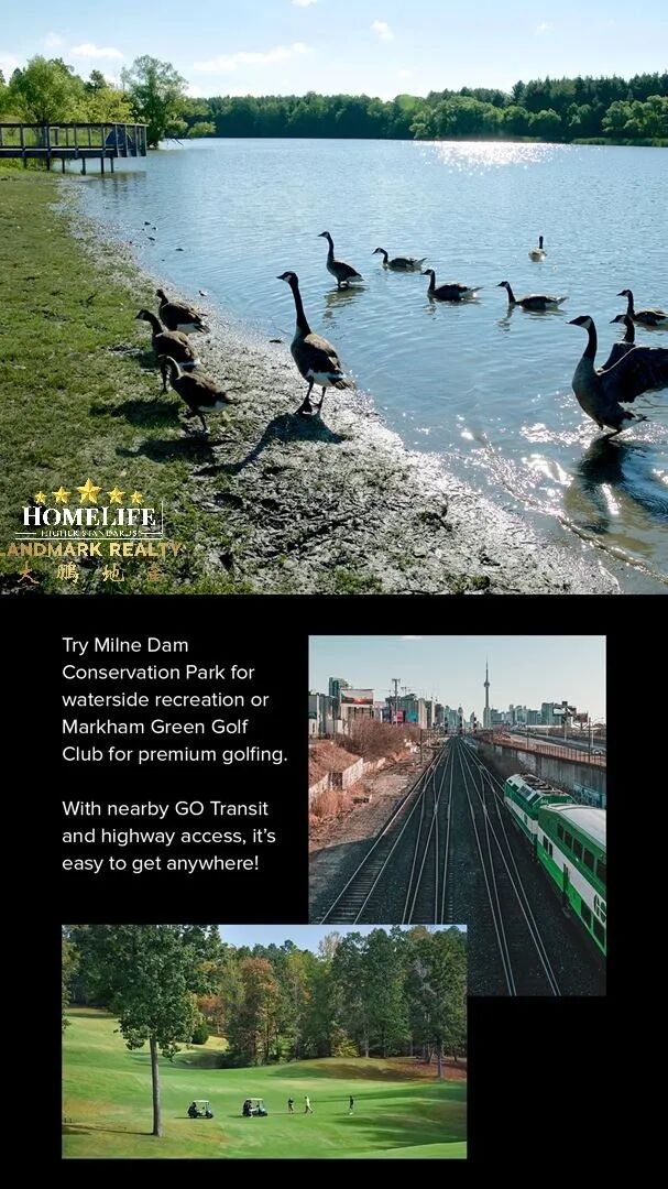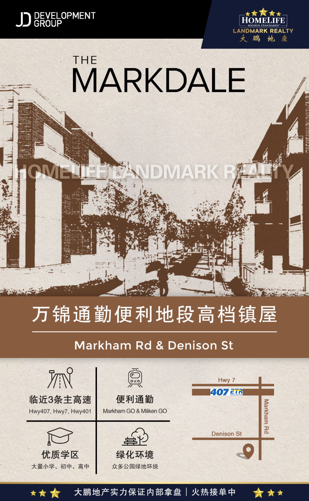 The Markdale豪华镇屋项目位于万锦市Denison Street 和 Markham Road的交汇处。社区成熟,生活舒适,出门就有众多餐厅、零售和商店选择。交通便利,驱车4分钟可直通407号高速公路,10分钟可达Miliken Go Station,11分钟可达历史悠久的Unionville大街,12分钟可达高尔夫球场(Remington Parkview Golf)。社区教育资源丰富,拥有众多小学、初中和高中的优质学区。