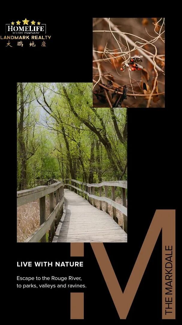 The Markdale周边公园绿地环绕,风景秀美,非常宜居。驱车9分钟即可抵达Rouge River,附近拥有Rouge National Urban Park, Rouge Valley Park 等众多自然保护景区。西北方向驱车11分钟,可抵达Milne Dam Conservation Park休闲度假胜地,徒步、钓鱼、野餐或远足穿过长长的悬索桥。东北方向驱车9分钟,可抵达Markham Green 高尔夫俱乐部。