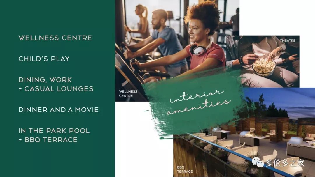 室外有人造观景水池、度假式木质凉亭、BBQ炉台,儿童游乐场等,室内有设施齐备的健身房和室内电影院,并配备舒适的贵宾休息室和餐饮区。