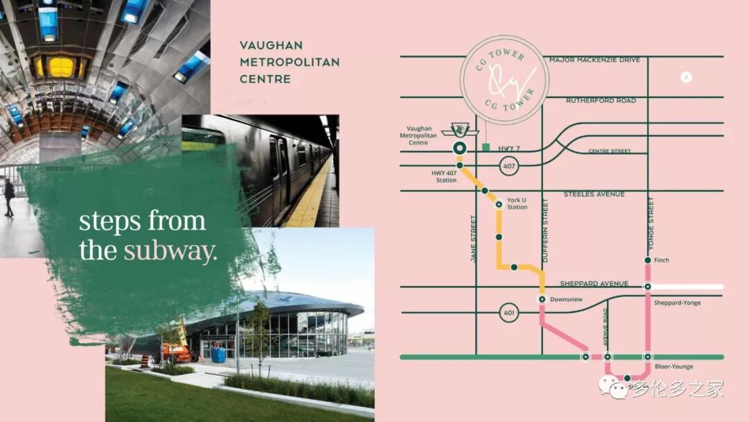 再来说交通。多伦多西线Downsview地铁延伸线将把“多伦多”、“Yorkdale Mall”、“约克大学”和新旺市中心VMC连成一体。另外旺市政府投资6200万加币兴建了新的VIVA快速干线,始发站为VMC,CG Tower所在社区EXPO CITY距离未来地铁延伸线旺市Jane终点站仅咫尺之遥。