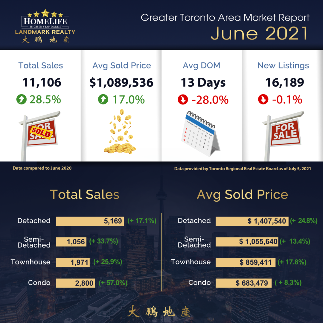 大多伦多地区REALTORS® 报告称,2021年 6 月通过TRREB 的 MLS® 系统实现了11,106 笔销售量 – 与 2020 年 6 月相比增长了28.5%。从 GTA 整体来看,公寓细分市场的同比销售数量增长最为强劲,无论是在多伦多市还是周边的一些郊区。