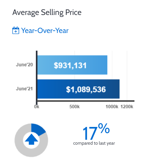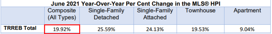 2021 年6 月 MLS® 房屋价格指数综合基准同比上涨19.9%。所有房屋类型的平均售价在同一时期上涨了17%,达到1,089,536 加元。