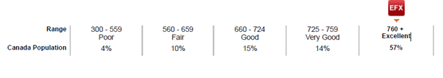 分数范围由300至900分,分数越高代表信用越好。根据Equifax提供的报告,加拿大的人均信用在700分左右。